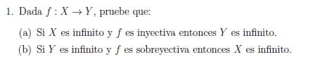 b) Si Y es infinito y f de X en Y es sobreyectiva entonces X es infinito.