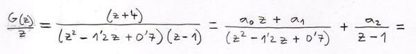 Tengo la siguiente ecuación, ya se que lo normal seria trabajar con g(z) pero en este caso tengo g(z)/z porque a partir del resultado que no se hallar habría que hacer una (transformada z) que es alfo muy parecido a la (transformada de laplace), pero eso no me interesa por ahora.