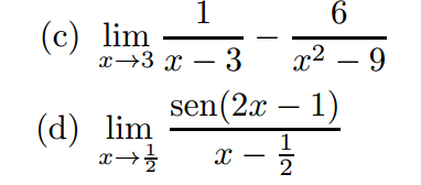 $$\begin{align}&\frac {1}{x-3}-\frac{6}{(x+3)(x-3)}=\\ &\\ &\frac{x+3-6}{(x+3)(x-3)} =\frac{x-3}{(x+3)(x-3)}=\\ &\\ &\frac{1}{x+3}\\ &\\ &\text{Y el límite de esto ya no tiene ningún problema}\\ &\\ &\lim_{x \to 3}\frac{1}{x+3} = \frac 16\\ &\\ &\end{align}$$d)
