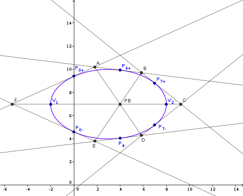 $$\begin{align}&y= y_0 +m(x-x_0)\\ &\\ &r_{0+}:\; y=\frac{47}{5}+\frac{9}{20}x=\frac{188+9x}{20}\\ &\\ &\\ &\\ &\\ &\\ &r_{4+}:\; y = 7+\frac{6 \sqrt 6}{5}-\frac{(x-4) \sqrt 6}{20}\\ &\\ &r_{4+}:\; y=\frac{140+28 \sqrt 6-x \sqrt 6}{20}\\ &\\ &\\ &\\ &\\ &\\ &r_{7+}:\; y=\frac {44-4(x-7)}{5}=\frac{72-4x}{5}\\ &\\ &\\ &\\ &\\ &\\ &r_{7-}:\; y=\frac{26}{5} +\frac {4(x-7)}{5}=\frac{-2+4x}{5}\\ &\\ &\\ &\\ &\\ &r_{4-}:\; y = 7-\frac{6 \sqrt 6}{5}+\frac{(x-4) \sqrt 6}{20}\\ &\\ &r_{4-}:\; y =\frac{140-28 \sqrt 6+ x \sqrt 6}{20}\\ &\\ &\\ &\\ &\\ &r_{0-}:\; y=\frac{23}{5}-\frac{9}{20}x=\frac{92-9x}{20}\end{align}$$Ahora toca hacer la intersección de cada recta con la siguiente, casi nada.