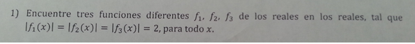 Matemáticas clayre73 el 10 ene. 14 Problemas de calculo a Seguir Siguiendo Dejar de seguir 1 Respuesta Respuesta de Valero Angel Serrano Mercadal 1 1 Valero Angel Serrano Mercadal, Me voy x tiempo. Necesito hacer otras cosas, descansar y que... f1(x) = 2f2(x) = - 2f3(x) = -2 si x € Q 2 si x no pertenece a QSupongo que esas te valdrán, a no ser que estén pidiendo cosas muy complicadas. el 11 ene. 14 - Anónimo ahora mismo Añadir comentario Usa los comentarios si quieres aportar algo a esta respuesta. No los utilices para preguntar algo nuevo. Cancelar Enviar