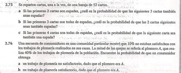 Dianis 1556! 2.75 Una baraja con 52 cartas tiene 13 cartas en cada palo. a) Si han salido 2 espadas quedan 11 espadas por salir y 50 cartas. Así, la probabilidad de que la siguiente sea espada es P(tercera espada) = 11/50 Ahora para que salga espada también en la cuarta hay 10 espadas sobre 49 cartas, luego P(Tercera y cuarta espada) = 10/49 P(tercera espada) Y para la quinta habiendo sido espadas las anteriores P(Quinta espada) = 9 / 48 P(tercera y cuarta espadas) Haciendo las cuentas, la probabilidad de que suceda todo eso P(Tercera, cuarta y quinta sean espadas) = (11/50)(10/49)(9/48) = 990 / 117600 = 0,0084183673 b) Es lo mismo solo que unicamente hay que contar los dos últimos pasos y queda P(cuarta y tercer espada) =(10/49)(9/48) =90 / 2352 = 0,0382653 c) Unicamente es P(quinta espada) = 9/48 = 0,1875 -------------------- 2.76 Hay que calcular probabilidades condicionadas P(X | Y) = P(X n Y) / P(Y) POR será el suceso de tener un trabajo satisfactorio o insatisfactorio Y es el suceso de que el plomero sea A He utilizado letras POR e Y en lugar de las habituales A y B por no confundir los suscesos con el nombre A del plomero. a) Conocemos P(Y) porque nos dicen que es el 40% = 0,4 Y conocemos la probabilidad de trabajo insatisfactorio dado el plomero A porque nos dicen que tiene la mitad de las quejas y las quejas son del 10 % =0,1. Luego las quejas asociadas al plomero A son 0,1/2 = 0,05 Pues con estos datos tenemos P(insatisfactorio | plomero A) = 0,05 / 0,4 = 0,125 b) Es la probabilidad complementaria de 1 de la calculada antes P(satisfactorio | plomero A) = 1 - 0,125 = 0,875 Y eso es todo.