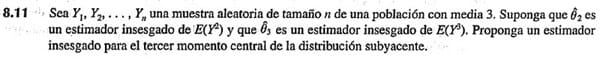 Matemáticas mayerly429 el 27 sep. 12 Sesgo y error cuadrático medio de estimadores puntuales. 11 Seguir Siguiendo Dejar de seguir 1 Respuesta Respuesta de Valero Angel Serrano Mercadal 1 1 Valero Angel Serrano Mercadal, Me voy x tiempo. Necesito hacer otras cosas, descansar y que... El tercer momento central es esto:$$\begin{align}&\mu_3=E[(Y-\mu)^3] =\\ &\\ &E(Y^3-3Y^2\mu+3Y\mu^2-\mu^3)=\\ &\\ &\text {el valor de }\mu \;es\; 3 \\ &\\ &=E(Y^3)-9E(Y^2) +27E(Y) -27=\\ &\\ &\text{E(Y) = 3 y ponemos los estimadores que nos dieron}\\ &\\ &= \widehat{\theta}_3-9\widehat{\theta}_2+81-27=\\ &\\ &\widehat{\theta}_3-9\widehat{\theta}_2+54\end{align}$$Y eso es todo. el 8 oct. 12 - Anónimo ahora mismo Añadir comentario Usa los comentarios si quieres aportar algo a esta respuesta. No los utilices para preguntar algo nuevo. Cancelar Enviar