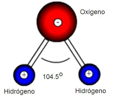 9.- La formación del agua será por medio de dos átomos de H(+) con uno de O(-2) formando la molécula por medio de enlaces convalentes H-O-H. El ángulo entre ambos H será de 104.5º, donde en la parte posterior se alojan los electrones libres del O que no han reaccionado con los H, porque como dijimos al inicio, el O tiene 6 electrones en su última capa. La figura sería algo como esto:
