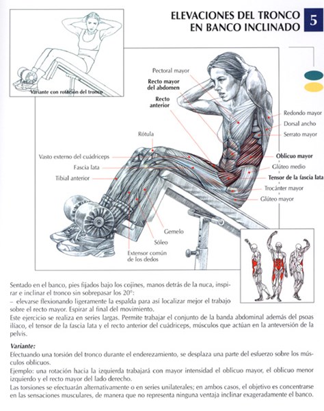 Abdominales, en banca declinada (3 series de 16 repeticiones)