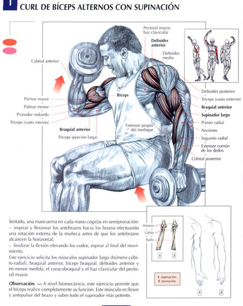 Curl c/mancuerna para bíceps sentado alternado con 20 libras (3 series de 10 repts c/brazo)