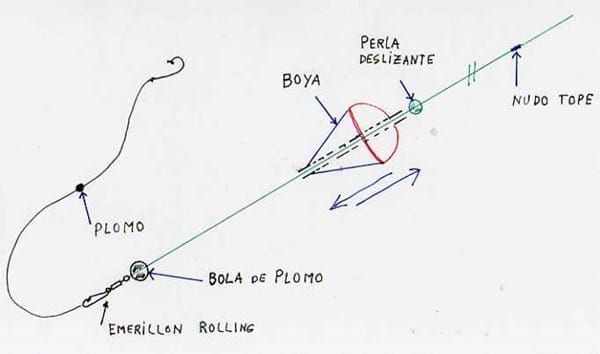 Hola, en varias páginas he visto que la mejor forma de montar una línea para pescar a la boloñesa cuando hay demasiado fondo y queremos dejar el flotador y la postura sujetos en un lugar sin que se lo lleve la corriente por el aire es montar un flotador deslizante. He encontrado este dibujo en una de las páginas, pero tengo un par de dudas, por si alguien me puede ayudar.