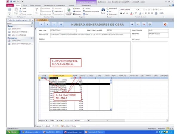 Estoy creando una base de datos en access, he creado un formulario con subformularios, dentro del subformulario necesito que al escribir en una columna (descripciones) se despliegue una lista que he creado en otra tabla(lista de materiales), y me permita elegir una material de dicha lista, al seleccionarlo me auto rellene campos. Por ejemplo costo,clave, u otro datos.