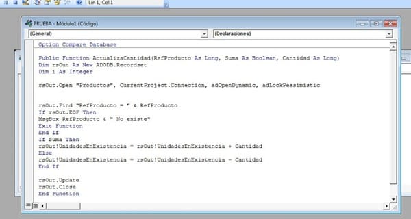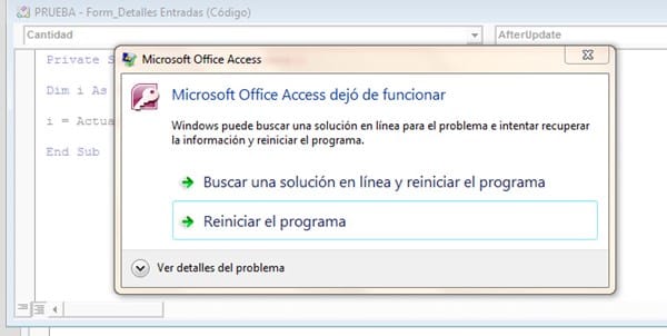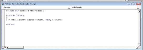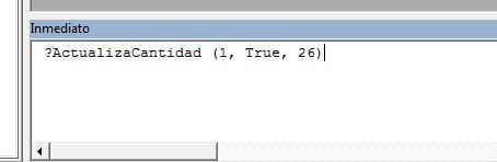 Ahora, se supone que debe funcionar, lo que ocurre es que cuando lo ejecuto desde la pantalla "Inmediato" (CTRL + G),¿? ActualizaCantidad ( 2, True, 25), se me cierra Access, igualmente pasa cuando lo pruebo desde el Formulario "Detalle Entradas".