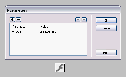 En el panel Properties panel, elegimos Parameters y para el parámetro ponemos "wmode" (sin las comillas). Para el valor en Value, "transparent". Guardamos el documento.