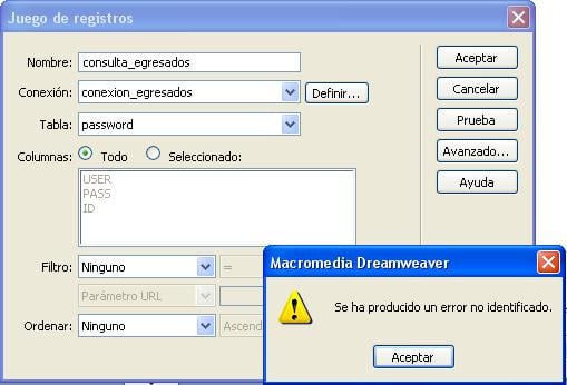 El error te lo da cuando accede a los registros, no es un error de Dreamweaver, creo que es de MySQL. Elimina todo, deja las tablas con un solo dato de prueba y hazlo de nuevo.