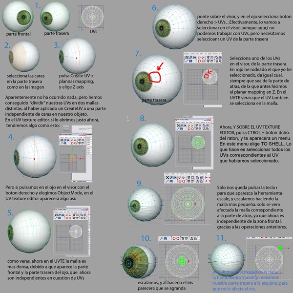 http://www.foro3d.com/f121/modelado-paso-a-paso-cabeza-humana-con-autodesk-maya-70946.html), te indica que lo hagas con un planar mapping y selecciones 'camera' (pg. 48 del archivo pdf). Esto está bien, y es útil, pero no es una proyección perfecta, ya que al seleccionar todo el ojo y hacer una proyección frontal, la mitad delantera y la trasera van a ocupar el mismo lugar en el UVTE. Para seguir con ejemplo de la naranja, imagina que sería como cortar la naranja por la mitad, y quitar de una sola vez la piel de cada uno de los lados (se nos quedarían como dos mitades de piel idénticas. Y ahora intentáramos meterlas ambas, una encima de otra, en un libro, y aplastarlas. Al abrir el libro, quedarían una sobre otra y con forma circular. Exactamente como el ojo en tu UVTE. Ambas mitades coinciden, y por ello al poner una textura, la textura aparece en la parte frontal y en la trasera. En el tutorial no indica este inconveniente ya que la parte trasera del ojo va a estar oculta e invisible, y no lo toma en cuenta. Puedes hacerlo así, o bien, una vez hecho esto, puedes seleccionar las caras traseras como te comenté en el mensaje anterior y volver a hacer un Planar mapping, esta vez en Z. Esto consigue 'separar' ambas redes de UVs y hacerlas independientes en el UVTE, ya que de la otra forma sería sólo una malla de UVs y no podríamos separarlos.