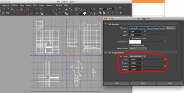 Tengo una duda, en la ventana de "UV Texture Editor" quiero hacer una imagen de referencia para mi textura, pero quiero hacerlo únicamente de la imagen izquierda superior, y se que es en "Uv Range Options" pero la verdad no entiendo como funciona. Le he dado distintos valores y me da SnapShots de todos los cuadros menos del que yo quiero.