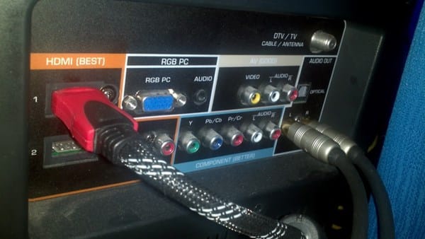 parte de atrás de la pantalla con la entrada hdmi que viene de mi tarjeta de audio y las salidas rca que van hacia mi poder de 150w