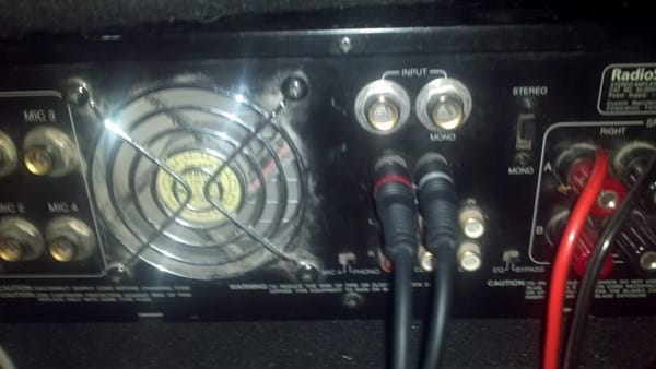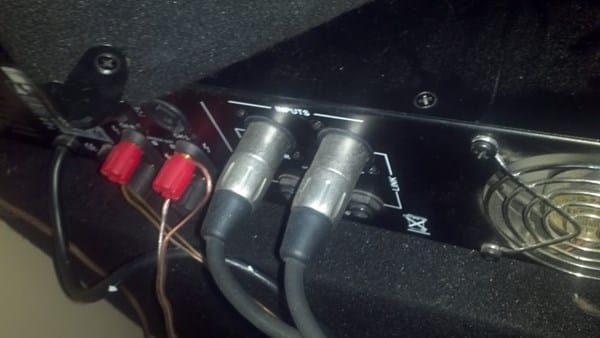 parte de atrás de mi poder de 150w con los imputs de cannon a rca que vienen de la pantalla