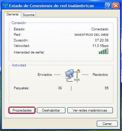 Paso 6. Ve a propiedades de conexión de redes inalámbrica. Pulsa de nuevo dos veces sobre la pantalla pequeñita junto al reloj o abre con el botón derecho pulsando en Estado.
