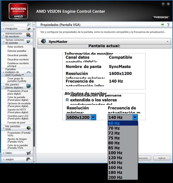 he visto que la eleccion de esos 200 Hz en el ADM VISIÓN Center Control está en la sección que corresponde al Sync Master o sea el monitor de 20" VGA