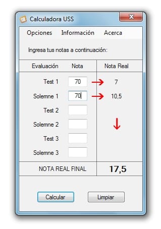 Al final del hay una etiqueta llamada "SumaPorcentajes" que debería sumar y redondear los porcentajes, que son valores en decimal (de la columna "Nota Real", tal como muestra la imagen). Es decir, la función de esa etiqueta es mostrar la suma de los porcentajes a medida que se vayan ingresando las mismas, con el objetivo de mostrar la nota final real.