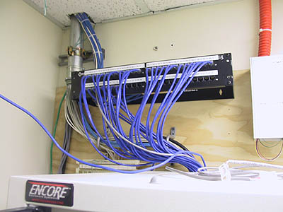 Aquí tienes un ejemplo de manojo que viene desde el techo... cables que son los esparcidos por las paredes hasta las fichas en la pared... se meten en la pachera... y desde la pachera hacia un switch: