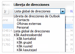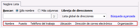 En la lista Libreta de direcciones, haga clic en la libreta en la que desee buscar nombres. Las libretas de direcciones de la lista Libreta de direcciones, salvo la Lista global de direcciones (LGD) (Lista global de direcciones: libreta de direcciones que contienen todas las direcciones de correo electrónico de usuarios, grupos y listas de distribución de la organización. El administrador crea y mantiene esta libreta de direcciones. También puede contener direcciones de correo electrónico de una carpeta pública.), se crean a partir de las carpetas de Contactos. De forma predeterminada, el contenido de la carpeta Contactos principal de Outlook conforma la Libreta de direcciones de Outlook (Libreta de direcciones de Outlook: libreta de direcciones que se crea automáticamente a partir de los contactos de la carpeta Contactos. Los contactos pueden ser personas de dentro y fuera de la organización. Al actualizar los contactos, la Libreta de direcciones de Outlook también
