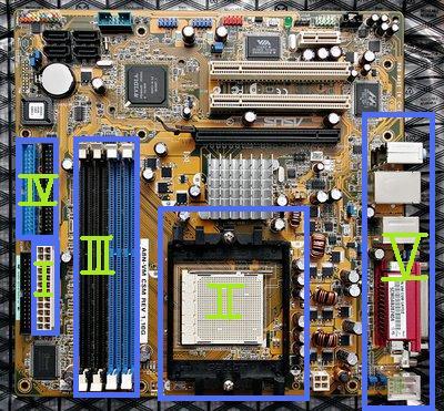 En el III tenemos la famosa RAM. Los zócalos azules son XPress (o sea, las rápidas) y los zócalos negros son DIMM normales (más lentos). Así que, posiblemente tú tendrás los zócalos azules con 2 módulos y los negros sin ninguno (no se suelen llevar bien combinar de los 2 tipos, o usas un tipo o el otro). El primer módulo al que accede el sistema es el que está más cerca de tu microprocesador y el que está detrás es el segundo. Ese segundo es el que te comentaba que es el que creo que tienes "quemado".