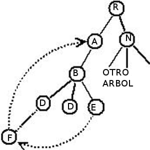 Luego pensé en recordar la ruta a la que llevaba el ultimo enlace visitado y si ya se había visitado no volver a hacerlo, pero a parte de que podría recorrer dos veces la misma rama, me surgió otro problema, que pondré en un esquema para que se entienda mejor.
