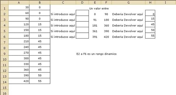 Hola amigos, en la siguiente hoja requiero introducir un valor, por ejemplo en la celda D2 para que me devuelva en H2 el valor que corresponde según el rango A1:B14. Esto puedo hacerlo con la función BUSCARV, pero si el valor no es coincidente con los mostrados en el rango A1:B14, me devuelve el valor inferior inmediato al introducido en D2, y lo que quiero es que muestre el valor superior. Si introduzco 182 en D4, me devuelve 15 y lo que quiero es que me devuelva 45. ¿Hay alguna forma de hacerlo?... Gracias de antemano