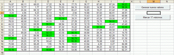 La cuestión es que tengo una tabla (cuyos datos son varaibles) y necesitaría saber cómo conseguir que me marque los 17 valores superiores de la misma. La tabla contiene 17 columnas y unas 10 filas. Los valores de la tabla, están relacionados con otro documento, y se modificarán paulatinament, y quisiera poder detectar los valores máximos cada vez que modifico alguno de esos datos de partida.