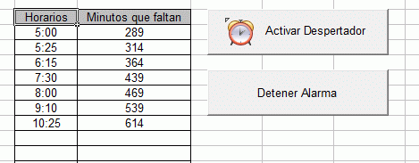 En una columna tengo diferentes horarios que van de las 00:00 hasta las 23:59, el asunto es que 5 minutos antes de que vaya cumpliéndose cada horario de acuerdo a la del sistema suene la alarma. El trabajo que estoy realizando es que en un dormitorio hay personas que piden despertarlos a cierta hora. El asunto es que excel me avise mediante una alarma 5 minutos antes de la hora que especificada. Espero haberme explicado de antemano un agradecimiento maestro.