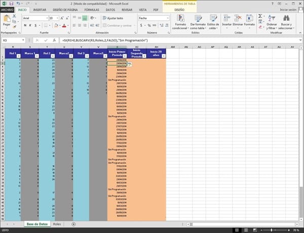 La siguiente imagen es un ejemplo de programación de vacaciones, con una función de BuscarV dependiendo del "Rol 1" (columna R), hago que se ponga la fecha en "Inicio Primer Periodo" (columna POR), con una función lógica, si no hay programación hago que se ponga la leyenda "Sin Programación". Hasta aquí todo bien. La cuestión viene si en "Rol 2" (columna T) no viene nada, pero en "Rol 1" (columna R) si, quisiera que en "Inicio Segundo Periodo" (columna AC) se quedara en blanco, conservando la condición de que si en ninguna de las columnas de "Rol 1" y "Rol 2" hay valor en "Inicio Segundo Periodo" (columna AC) saliera la leyenda "Sin Programación".