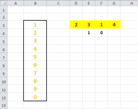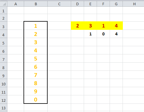 Ahora bien, como ya tengo un valor que es el 1 (E4), necesito buscar la diferencia o el numero que me falta para llegar al tercer dígito del numero base (F3), con respecto a los números de referencia ( B3:B12 ). En este caso seria 0 (cero), porque de 1 a 1 hay cero de diferencia. Quedando asi: