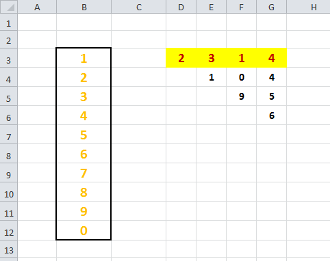 Necesito buscar la diferencia o el numero que me falta para llegar de 9 (nueve) hasta el tercer dígito del numero base (G4), de acuerdo o con respecto a los números de referencia ( B3:B12 ), seria 9 a 4 = 5. Por que seria 9-01234 hay cinco dígitos de diferencia. Asi: