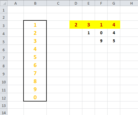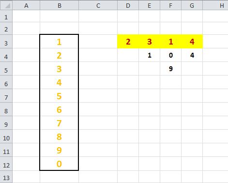 Necesito la diferencia o el numero que me falta, del primer dígito ( 1 ) del numero base (104), para llegar a el segundo dígito del numero base ( 0 ). Esto, de acuerdo o con respecto a los números de referencia ( B3:B12 ), en este caso del 1 al 0 = 9, por que si contamos del 1 hasta el 0 ( B3:B12 ) los separan 9 dígitos. Quedando asi: