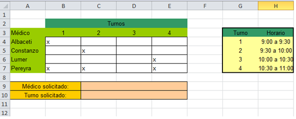 El problema consiste en responder a la solicitud de un turno, informando si dicho horario se halla disponible o no.Si el turno está libre entonces se informa el horario, sino no. Para reservar turnos se recurre a la consulta de la tabla correspondiente. En la tabla, una x significa turno reservado (esto se hace manualmente).