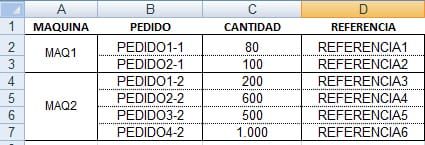 El problema es que si la máquina1 ha hecho 2 pedidos ocupará las filas 2 y 3 pero en la columna A aparece el nombre MAQ1 en una celda combinada que ocupa la fila 2 y 3.
