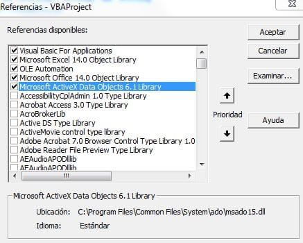 El autor de la macro decía que "El código requiere una referencia a la librería "Microsoft ActiveX Data Objects #.# Library" (donde #.# es el numero de la