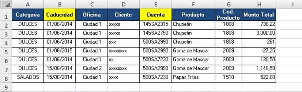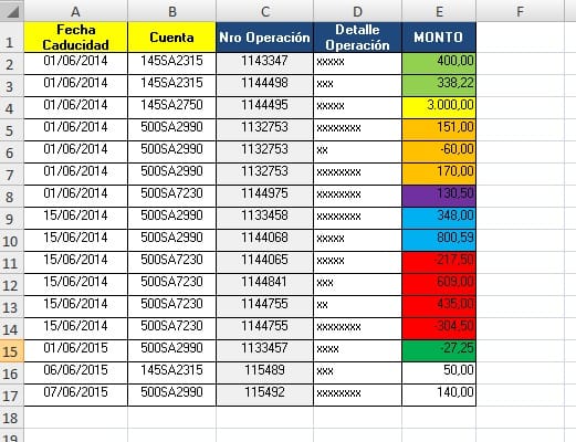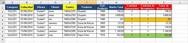 - Suma de Movimientos: Es la suma del Monto (Libro Sistema) con las siguientes condiciones entre los dos libros (Columnas de color amarillo): Cuenta tiene que ser la misma, Fecha de caducidad tiene que ser la misma.
