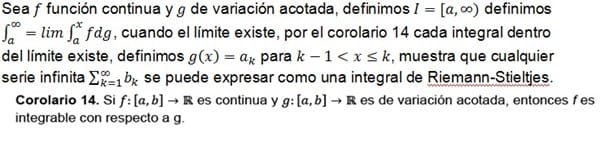 $$\begin{align}&\sum_{k=1}^{\infty}b_k\\ &tomamos\\ &g(x) =b_k \:para\; k-1\lt x\le k\\ &\\ &\sum_{k=1}^{\infty}b_k=\lim_{n\to\infty}\sum_{k=1}^n b_k=\lim_{n\to\infty}\sum_{k=1}^ng(k)=\\ &\\ &\lim_{n\to\infty}\sum_{k=1}^n g(k)\left(k-(k-1)\right)=\\ &\\ &\lim_{n\to\infty}\sum_{k=1}^n\int_{k-1}^k g(k)dx=\\ &\\ &\lim_{n\to\infty}\sum_{k=1}^n\int_{k-1}^k g(x)dx=\\ &\\ &\lim_{n\to\infty}\sum_{k=1}^n\int_{k-1}^k 1·dg(x)=\\ &\\ &\lim_{n\to\infty}\int_0^n1·dg(x)=\\ &\\ &\int_0^{\infty}1·dg(x)\end{align}$$