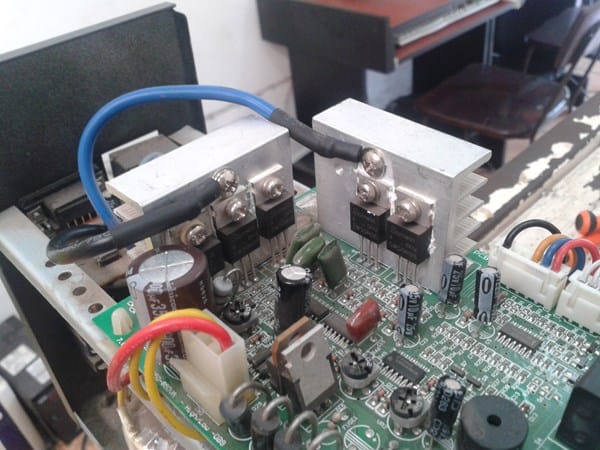 Me han dicho que esta falla la puede provocar los transistores Mosfet que se ven al fondo atornillados a los disipadores de calor. Pero quisiera saber si esto esta bien o puede ser alguana otra parte.
