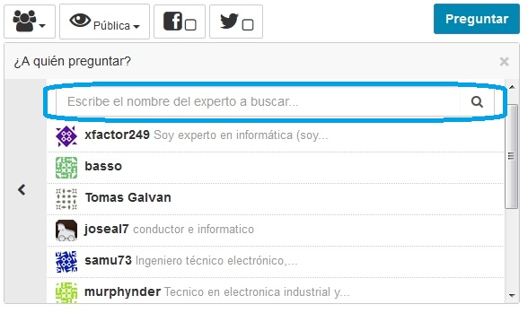 El nombre del experto buscado aparecerá y tan sólo tendremos que pulsar sobre su nombre para seleccionarlo. En ese momento ya queda escogido, y al enviar la pregunta irá dirigido en concreto a esa persona. Si se desea agregar otro experto unicamente habrá que repetir toda la operación, los expertos se irán acumulando. Por último enviamos la pregunta pulsando en el recuadro azul "Preguntar".