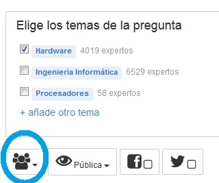 Pulsamos en el recuadro naranja que dice "Preguntar", está situado en la parte superior de la página, junto a la ventana de búsqueda. Acederemos a una nueva página en la que rellenaremos los campos "Escribe tu pregunta" y "Describe tu pregunta". Más abajo de ellas, vemos un tercer campo, llamado "Elige los temas de la pregunta", en el que seleccionaremos por adición el nombre del tema que deseemos.