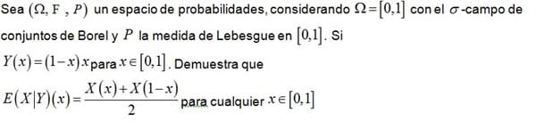 $$\begin{align}&1) E[X|Y] \;es \;sigma(Y)\text{-medible}\\ &2) \forall A \in \sigma(n) \;se\; cumple\;\int_AE(X|Y)dP=\int_AXdP\end{align}$$De algeebras, semianillos, medidas de Lebesgue y todo eso ando fatal, vamos nada, asi que no voy a poder ser riguroso.