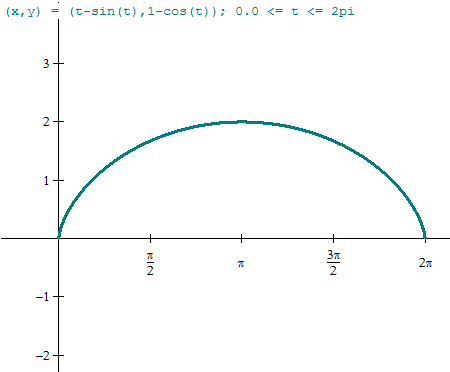 $$\begin{align}&V=\pi\int_{x_0}^{x_1}[f(x)]^2dx=\\ &\\ &\text{dividimos en intervalo en n trozos}\\ &\Delta x=\frac{x_1-x_0}{n}\\ &\\ &V=\pi\lim_{n\to \infty} \sum_{i=0}^{n-1}[f(x_0+i·\Delta x)]^2·\Delta x\\ &\\ &\text{Si dividimos el intervalo de tiempo en trozos}\\ &\\ &\Delta t = \frac{t_1-t_0}{n}\\ &\\ &V=\pi \lim_{n\to \infty}\sum_{n=0}^{n-1}[y(t_0+i·\Delta t)]^2·[x(t_o+(i+1)\Delta t)-x(t_0+i\Delta t)]\\ &\\ &\text{multiplicando y dividiendo por }\Delta t\\ &\\ &V=\pi \lim_{n\to \infty}\sum_{n=0}^{n-1}[y(t_0+i·\Delta t)]^2·\frac{x(t_o+(i+1)\Delta t)-x(t_0+i\Delta t)}{\Delta t}·\Delta t\\ &\\ &\text{El límite de ese cociente es la derivada en } t_0+i\Delta t\\ &\text{con lo cual queda}\\ &\\ &V=\pi \int_{t_0}^{t_1}[y(t)]^2·x'(t)\;dt\\ &\\ &\text{Y en este caso será}\end{align}$$$$\begin{align}&V=\pi\int_0^{2\pi}(1-\cos t)^2(1-cost)dt=\\ &\\ &\pi\int_0^{2\pi}(1-3cost+3cos^2t-\cos^3t)dt=\\ &\\ &\pi\left[t -3sent\right]_0^{2\pi}+\\ &\\ &\pi\int_0^{2\pi}\left(\frac{3}{2}+\frac{3cos 2t}{2}-(1-sen^2t)cost \right)dt=\\ &\\ &2\pi^2+\pi\left[\frac{3t}{2}+\frac{3sen 2t}{4}-sent \right]_0^{2\pi}+\\ &\\ &\int_0^{2\pi}sen^2t·cost\;dt=\\ &\\ &2\pi^2+3\pi^2+\left.\frac{sen^3t}{3}\right|_0^{2\pi}= 5\pi^2\approx 49.34802201\end{align}$$Aunque no es la misma figura veamos si se parece al elipsoide de semiejes pi, 2, 2