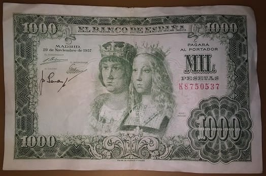 - 1.000 Pesetas 29/11/1957 Reyes católicos EBC Serie K ( Doblez central ) - Este diría que es sin circular pero ya os digo que no se mucho de esto y digo que es EBC porque tiene arrugillas pero es que al lado de los otros parece que está peor, pero está muy bien.