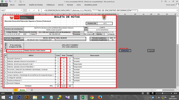 Hola expertos, tengo dos hojas en excel hoja1 ACTAS, hoja2 BOLETA DE NOTAS como se muestra en la imagen, tengo una dificultad, es que tengo que crear BOLETAS DE NOTAS de cada uno de los alumnos de la hoja1.