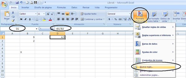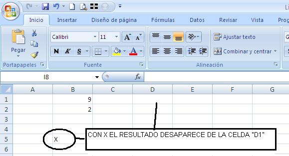 1. En "B1" pon un 9. En "B2" pon un 2. En "D1" escribe =B1/B2. En "B5" pon una "X" mayúscula.