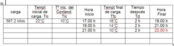 Un cargamento de 567.2 kilos originalmente a 22°C se pone en un contenedor a 10°C a las 17hrs. Se e