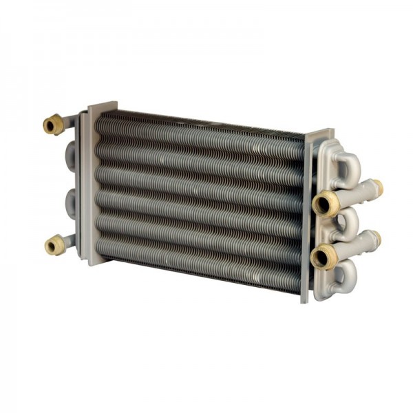 El intercambiador es una pieza donde convergen dos circuitos, el circuito primario que se llama, que vendría a ser el mismo circuito que lleva el agua que calienta los radiadores, y el circuito sanitario, o sea, el agua que sale por los grifos. Imaginate que metes un radiador del circuito de calefacción, dentro de un balde de agua, pues el calor de ese radiador(circuito primario), se transmite al agua sanitaria que tienes dentro del balde, y la calienta.