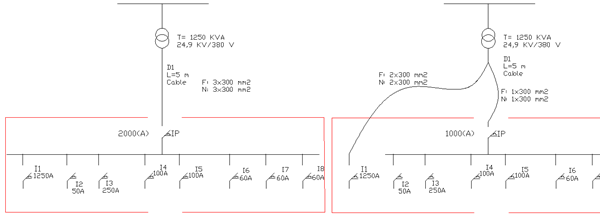 Buenas tardes a todos, tengo una duda en el montaje de un cuadro de BT, resulta que a la izquierda se tiene la disposición según yo adecuada, con un breaker principal que alimenta a unas barras y posteriormente a cada circuito. PERO resulta que este breaker es bastante caro sumado al de 1250 que tenemos como primera carga I1, y me sugieren hacer la conexión a la derecha en la que se deriva dos cables de los tres que se debe instalar por fase (debido a la alta corriente) a un breaker de 1250 y el cable restante a otra breaker de 1000 A (ya existente), tal como se muestra en el esquema.