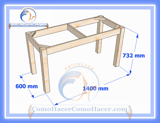 Os pongo este esquema que encontré para la idea de estructura, aunque es una mesa creo que es válida, añadiría unos traveseros en la parte inferior de las patas y 2 o 3 traveseros más en la superfície superior ya que la mesa del esquema es casi la mitad que mi proyecto. Luego esta estructura iría forrada con la madera de acacia así que a las patas verticales de la estructura le puedo restar 2 cm de sección ya que la madera de acacia es de 1,8 cm de ancho.